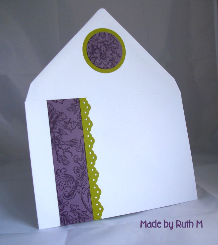 We stamped the French Filigree background stamp with VersaMark ink and embossed it with clear embossing powder on the white panel. The patterned paper is from the Cottage Wall pack. We scalloped the Rich Razzleberry piece of CS with the border punch.