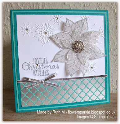 I've opted for aquas, (Bermuda Bay and Coastal Cabana) white and silver for my card. Danielle and I share a love of non traditional colour schemes for Christmas cards and I've loved using aquas, blues and white for quite a few Christmas cards this year! The card base measures 5 3/4" square. I embossed a piece of white CS with the Northern Flurry folder and stamped and heat embossed the sentiment. I added foiled paper from the Winter Frost DSP pack, layered onto a Bermuda Bay mat, added some silver ribbon and layered onto a Coastal Cabana mat. I then chose something that is traditionally red - I've used the wonderful poinsettia stamp from the SU! Joyful Christmas Season set. I stamped the flower twice onto vellum CS using Encore silver ink, sprinkled super sparkly Star Dust embossing powder on the image and heat embossed. I fussy cut, layered and popped up two flower shapes to create my sparkly poinsettia. I added a gorgeous Frosted Finishes embellishment to the flower centre and sprinkled a few rhinestones on the white panel to add more sparkle.