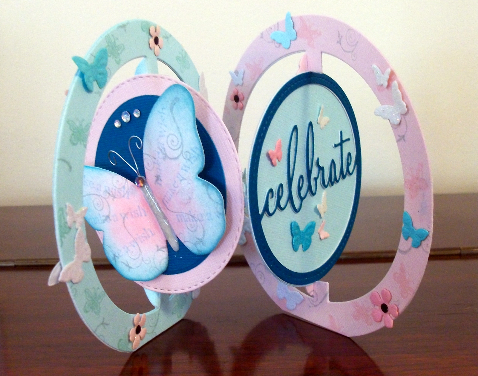 Janet made a circle pivot accordion card and added an inked, stamped and embellished butterfly.